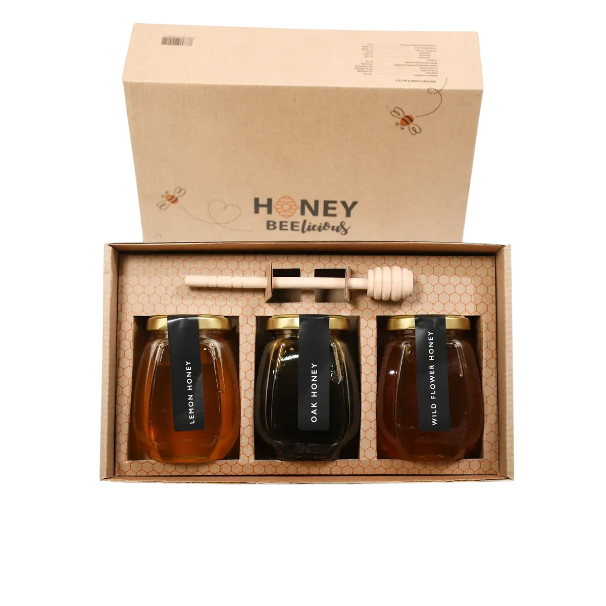 A lovely box of three jars lemon, wildflower and oak. 1 kilo and 200g weight of the whole jars